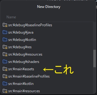 左のandroid構成一覧で,appのアイコン上で右クリック>new>directoryで作成します。(出てきたフォルダ候補中で src\main\assets を選びます。)